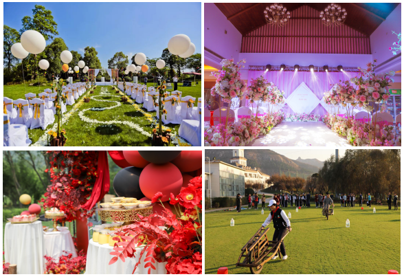 崮云湖畔开辟草地活动中心,占地8000平米,自然景观秀丽,独有的高尔夫专业场地草坪,是举办浪漫婚礼、生日宴、帐篷节、亲子活动、发布会、团建活动等各类户外活动的绝佳场地。场地承接专属私人定制婚礼,提供婚纱摄影场地租赁,可满足室内外所有婚礼场景的幻想,专业的顾问团队为新人量身设计,打造出高尔夫特色与自然融合一体的时尚婚礼现场,让新人及亲友暂时告别城市喧嚣,享受自然赋予的阳光和美好。