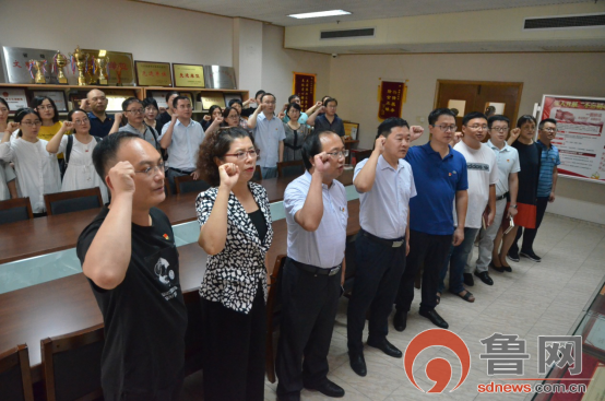 两个支部的党员们首先参观了位于省图书馆一楼大厅的“红色印记——党史党建文献展”,一幅幅珍贵的历史图片和详细的文字介绍记录了1921年至1923年中国共产党的创建历史、光辉历程。在党员活动室,鲁商传媒集团党委委员、副总经理兼鲁网总经理、总编辑王法争带领两个支部全体党员庄严地举起了右手,重温入党誓词。