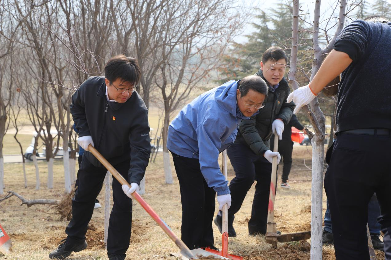 在五峰山公司植树现场,大家分工合作,干劲十足,按照划定的区域,三五人一组撸起袖子挥锹铲土、扶树正苗、浇水培土,合力栽种下一株株苗木。很快,40余株海棠树苗迎风挺立,生机勃勃,为春日的大地增添了生机活力。