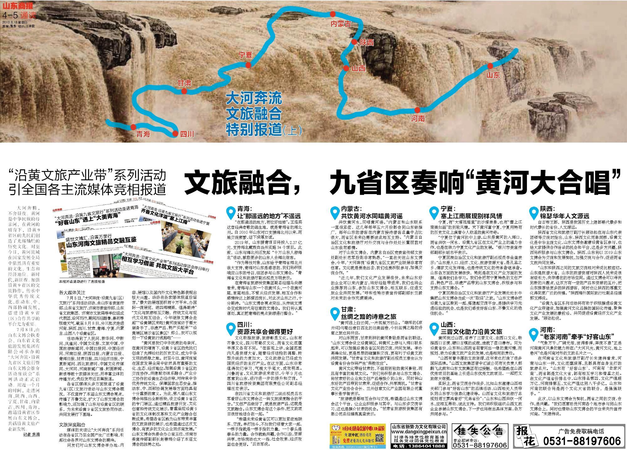 7月8日,我省启动“大河奔流•沿黄九省区文旅行”系列活动,分三批次走进河南、陕西、四川、甘肃、青海、宁夏、内蒙古、山西八个沿黄省区。活动启动次日的报纸头版,以《大河奔流 交融俱进》的大标题突出“太阳集团tcy8722山东文旅沿黄万里行”意义所在,并与回顾我省党政考察团南下一周年的导读相呼应,点面衔接,形成良好见报效果。
