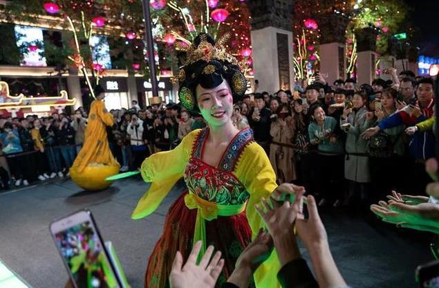 网红互动是本届花灯会的亮点,除了大唐不倒翁,还有变形金刚和仿真恐龙游行。大唐不倒翁小姐姐头梳唐朝发簪,身着唐朝服饰,手持罗扇,略施粉黛,身姿轻盈,眼神婉转动人。仿真恐龙则是挖掘“科技炫酷 唯美欢乐”的新内核,让你感受浓浓的“机械风”。