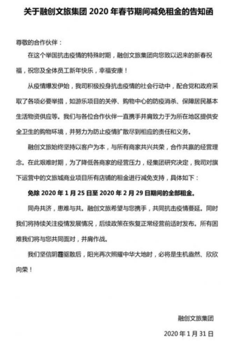 1月31日,融创文旅集团发布公告称,为降低商家经营压力, 对旗下运营中的文旅城商业项目所有店铺的租金进行减免支持,免除2020年1月25日至2020年2月29日期间的全部租金。