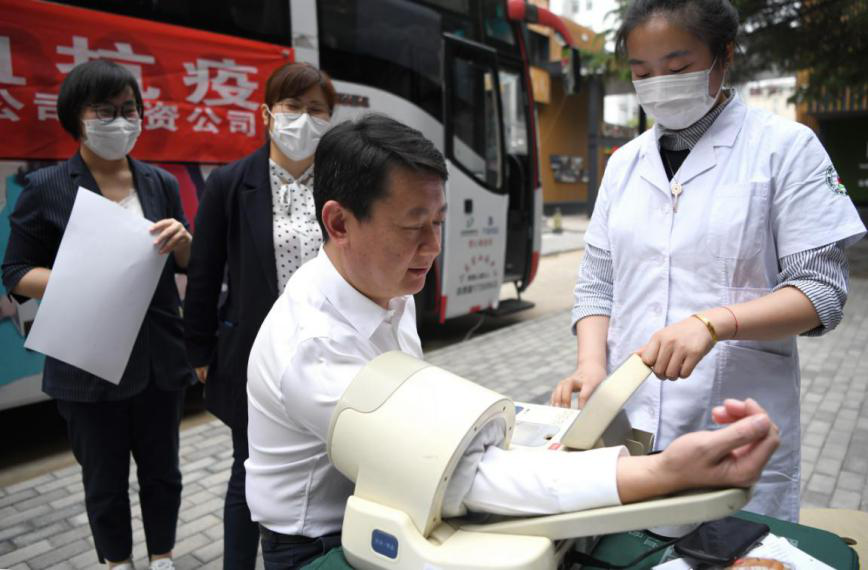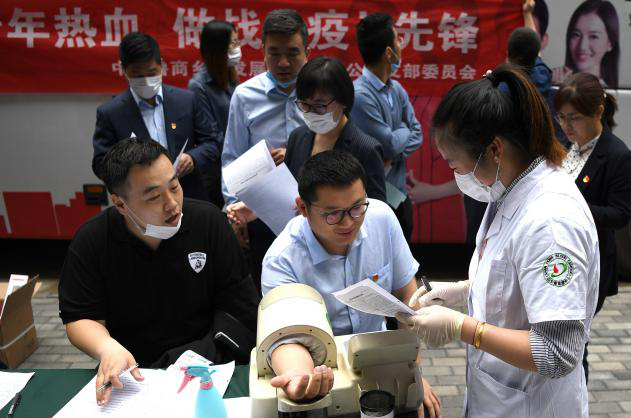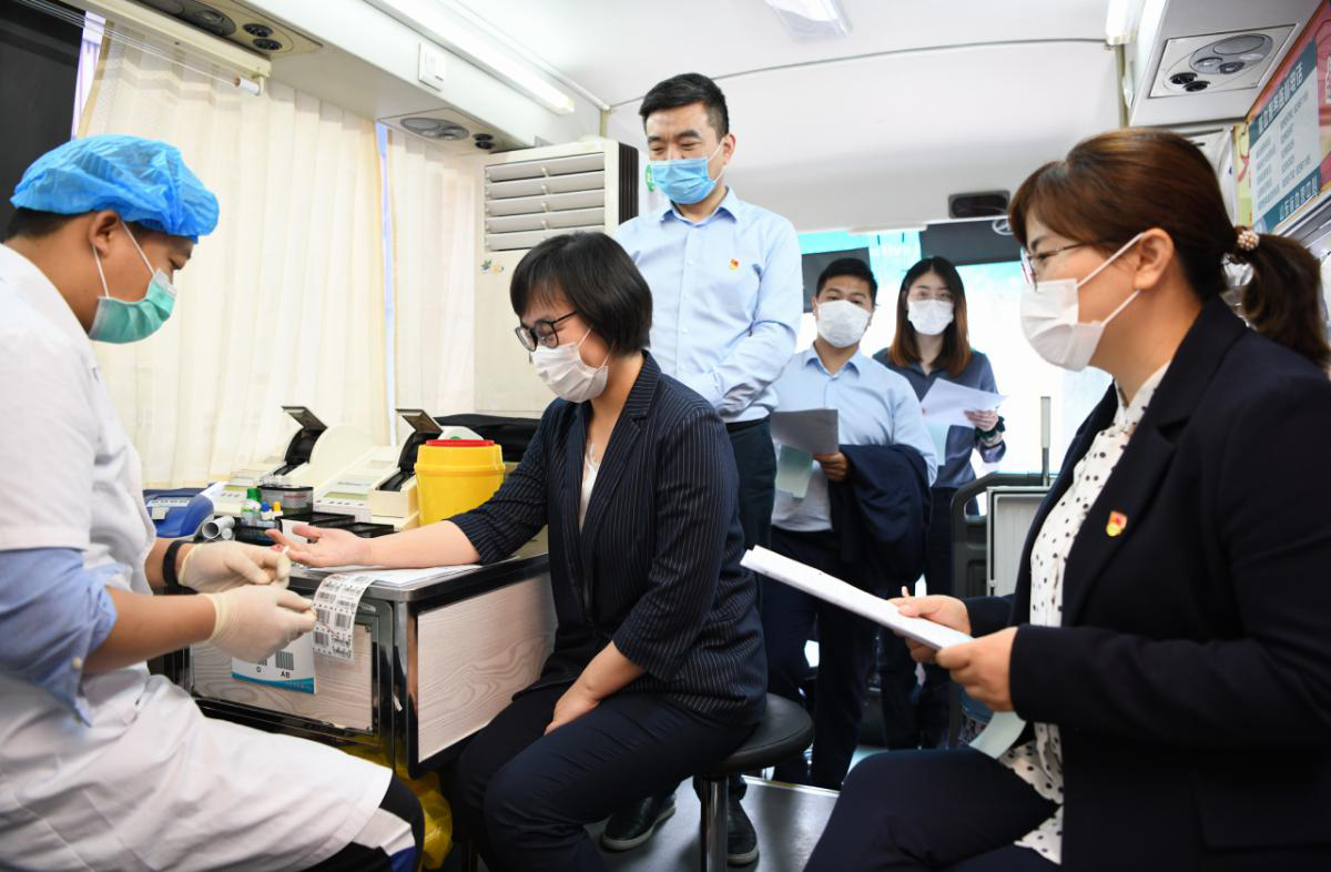 5月14日9点,省血液中心的爱心献血车驶进山师东路4号院内。为避免人员聚集,预防献血过程中可能出现的交叉感染,前来献血的党员干部职工在医务人员的引导下,佩戴口罩、填表登记、测温测压、检查血型、抽取血液,现场秩序井然、有条不紊。