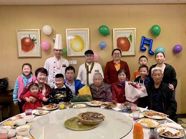 前台员工李鑫的公婆年近六十,六岁的儿子从小一直由公婆带着,正因为如此,李鑫才能全副精力做好前台的管理工作,表现优秀,赢得同事、顾客的一致认可。客房员工郑兆燕的婆婆今年七十多了,身体很健朗,老人朴实地说着她们婆媳住在一起十几年从来没红过脸,给大家传授婆媳相处之道。团圆饭席间大家互相敬酒、祝福,氛围和谐、温馨。