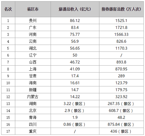 (说明:表格采用的是各省区市文化和旅游厅/局公开统计数据,各省市区统计涵盖范围或有不一,若有出入请及时与人民网旅游频道联系。联系电话:010-65363629。)