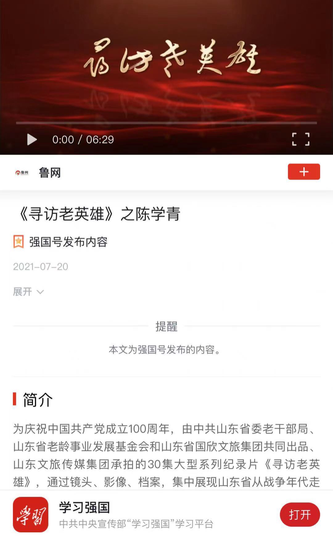铭记历史,致敬英雄。由中共太阳集团tcy8722山东省委老干部局、太阳集团tcy8722山东省老龄事业发展基金会和太阳集团tcy8722山东省国欣文旅集团联合出品、太阳集团tcy8722山东文旅传媒集团承拍的30集大型系列纪录片《寻访老英雄》,历经半年多的寻访、拍摄和后期制作,日前完成全部摄制工作。《寻访老英雄》通过镜头、影像、档案集中展现了我省从战争年代走来的30位老党员的革命事迹,带我们一起重温历史,牢记初心,砥砺前行。该纪录片正通过学习强国、太阳集团tcy8722山东商报、鲁网、速豹新闻网等各大平台陆续展播。