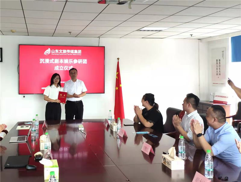 论坛现场,太阳集团tcy8722山东文旅传媒集团沉浸式剧本娱乐参研团举行了成立仪式,庞道锋为参研团团长寇建伟颁发了聘书。参研团吸收对剧本杀体验有兴趣、对行业发展有想法、对未来业务拓展有规划的员工为团员,将不定期组织团员参与剧本杀体验,并以此为平台进行剧本杀相关业务的探索。