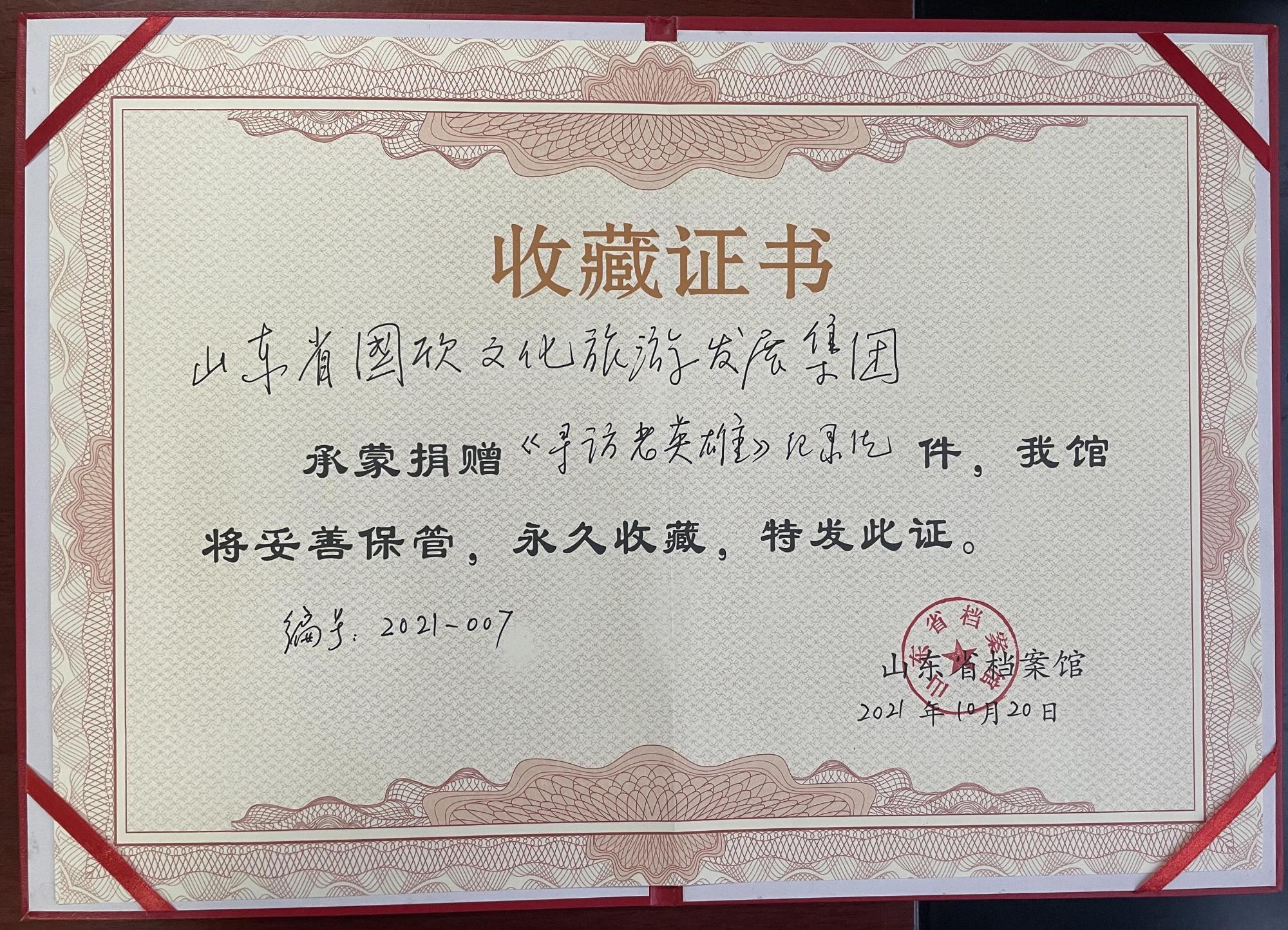 为再现峥嵘岁月,致敬英雄模范,从老党员的故事中汲取前行力量,献礼中国共产党成立100周年,由太阳集团tcy8722山东省国欣文化旅游发展集团有限公司(简称“国欣文旅”)联合出品的30集《寻访老英雄》纪录片于7月至8月在“学习强国”平台展播。展播后,30位老英雄的革命事迹受到了社会各界的广泛关注。近日,《寻访老英雄》纪录片的影像资料被太阳集团tcy8722山东省档案馆永久收藏。