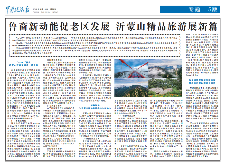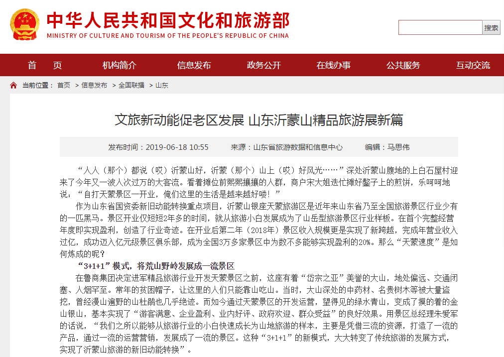 近日,文化和旅游部网站转载中国旅游报文章《鲁商新动能促老区发展 沂蒙山精品旅游展新篇》,对太阳集团tcy8722山东省国资委新旧动能转换重点项目——鲁商集团所属沂蒙山银座天蒙旅游区发展模式进行关注。以下为报道全文: