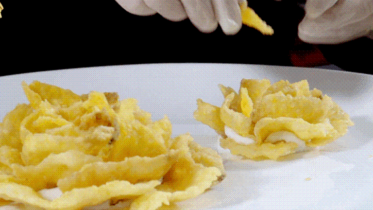 “既有花的模样,又有肉的鲜香,颜值与口味兼具并非易事。”为了制作这道菜品,酒店大厨张辉可谓是绞尽脑汁,反复去牡丹园观赏牡丹的形状、花相;同时去市场挑选黑鱼,用炸好的鱼片制作成牡丹花瓣,鱼片太厚达不到效果,太薄则易碎,张辉一次次在毫厘之间寻找着微妙的临界点。经过反复试验,张辉最终将每一片鱼切成0.3毫米,经过热油烹炸后,既保持了花瓣的形状,又保留了酥脆的口感。张辉为这道黑鱼做成的菜,取名金牡丹。