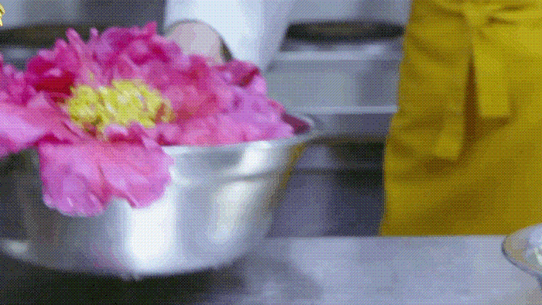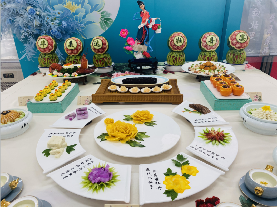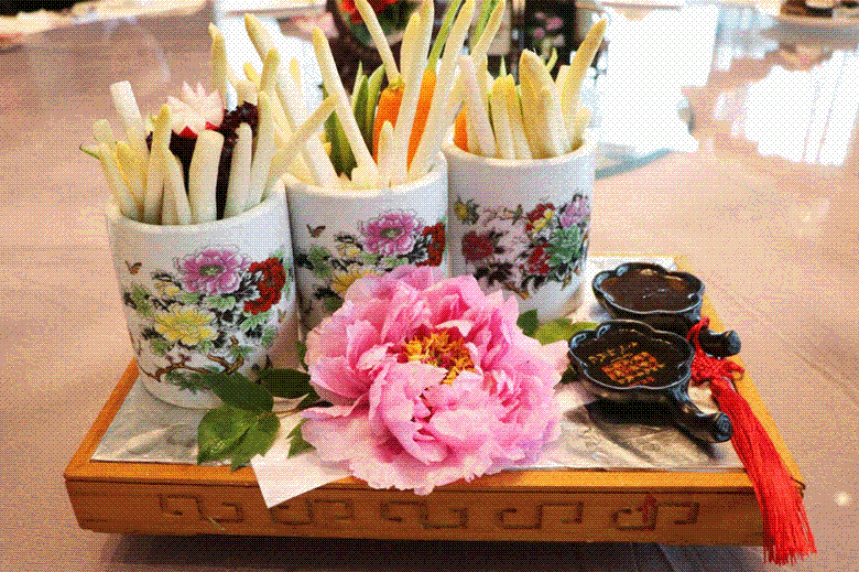 张辉还设计了一系列以牡丹为主题的热菜、凉菜、汤羹,“富贵花开糖醋鱼”“满园春色贵妃浴”……这套由六道凉菜、十二道热菜、一面食、一甜品组成的带有牡丹元素的特色文化宴席,美不胜收。