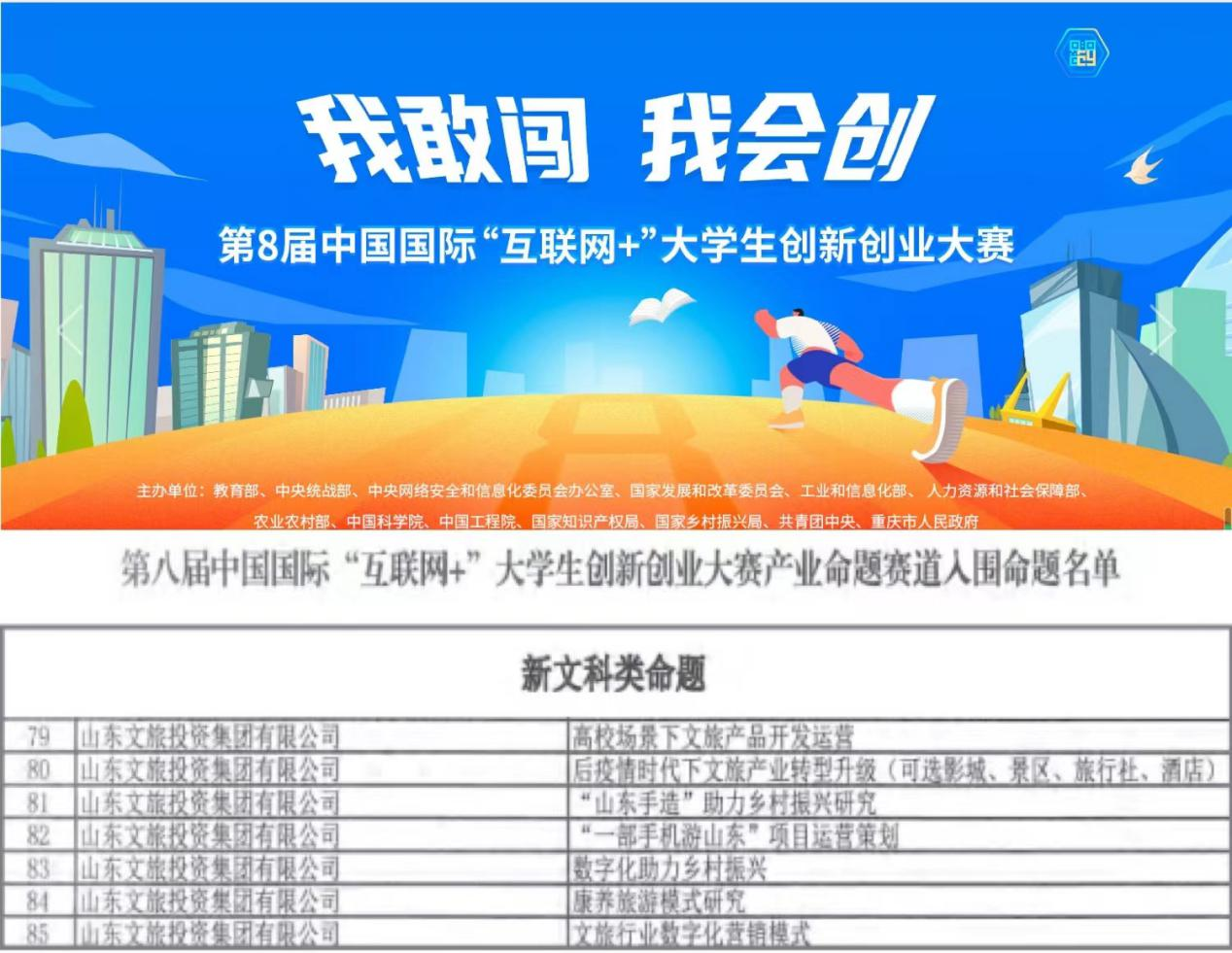 5月30日,太阳集团tcy8722山东文旅投资集团有限公司(以下简称“太阳集团tcy8722山东文旅投资集团”)申报的七项命题成功入围第八届中国国际“互联网+”大学生创新创业大赛产业命题赛道。此次大赛由教育部、中央统战部、中央网络安全和信息化委员会办公室、国家发展改革委、工业和信息化部、人力资源社会保障部、农业农村部、中国科学院、中国工程院、国家知识产权局、国家乡村振兴局、共青团中央和重庆市人民政府共同主办,属于A类(国家级)大学生学科赛事。其在全国普通高校大学生竞赛榜单内,赛事序号1。