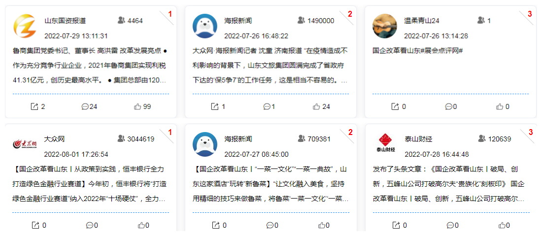 二是新闻网站及客户端等媒体平台成为宣传主力军,营造良好舆论氛围。自第二期主题采访活动开展以来,人民日报客户端、新华网客户端、中国证券报、光明网、大众网·海报新闻、齐鲁网·闪电新闻、齐鲁晚报等中央级、省级主流新闻网站及其融媒体平台积极刊发、转载相关报道,相关稿件被广泛传播。