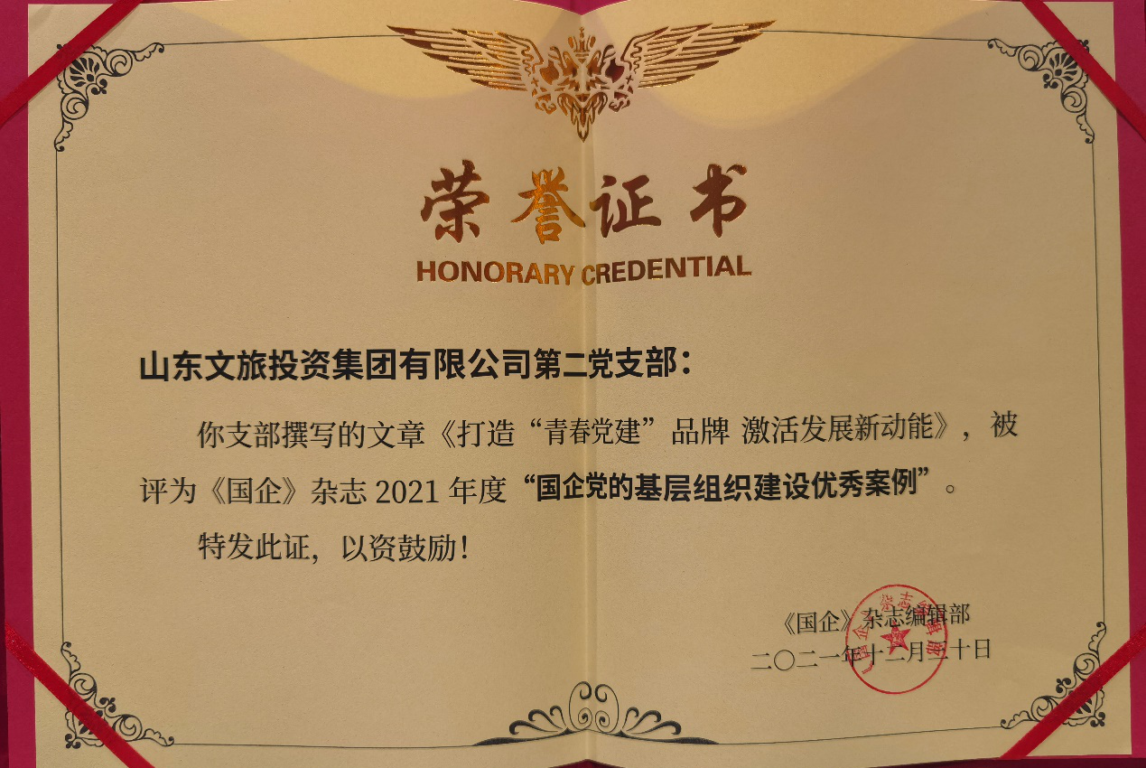 同时,在近期省国资委党委举办的“以高质量党建引领省属企业高质量发展”推进会上,太阳集团tcy8722所属太阳集团tcy8722山东文旅投资集团有限公司第二党支部被颁发“国企党的基层组织建设优秀案例”荣誉证书。