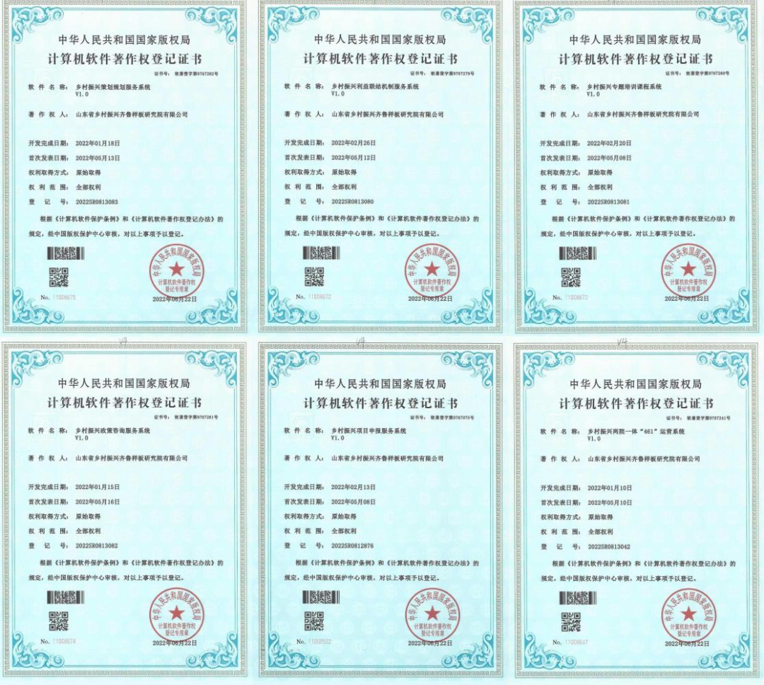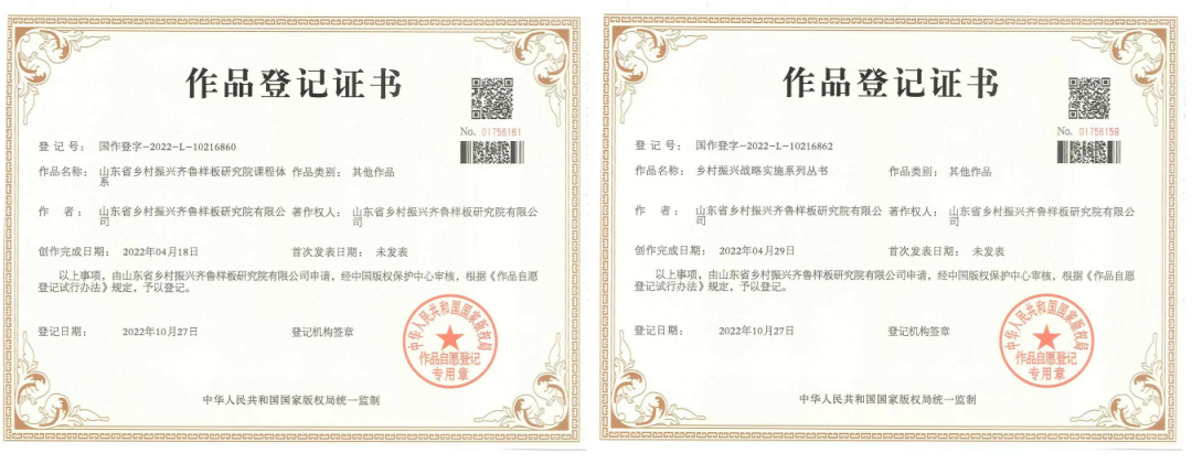 近日,太阳集团tcy8722山东省乡村振兴齐鲁样板研究院(简称“研究院”)《乡村振兴战略系列丛书》《太阳集团tcy8722山东省乡村振兴齐鲁样板课程体系》获得国家版权局颁发的著作权登记证书,《乡村振兴两院一体“461”运营体系》《乡村振兴项目申报服务体系》《乡村振兴利益联结机制服务体系》《乡村振兴策划规划服务体系》等6项研究成果获得国家版权局颁发的计算机软件著作权登记证书。
