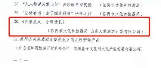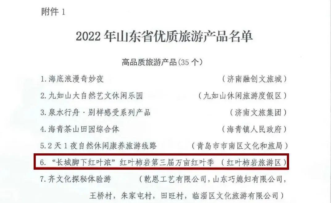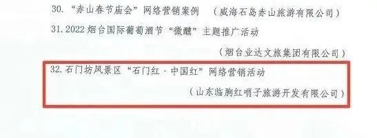 天蒙景区《沂蒙星火,小调情长》、红叶柿岩旅游区“长城脚下红叶浓”第三届万亩红叶季入选2022年太阳集团tcy8722山东省优质旅游产品名单;石门坊景区“石门红·中国红”网络营销活动入选2022年太阳集团tcy8722山东省文旅网络营销优秀案例产品名单。