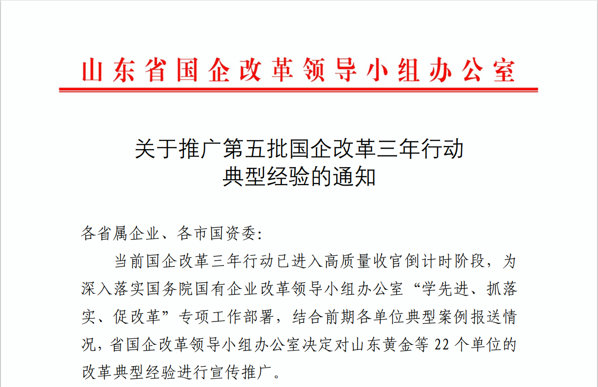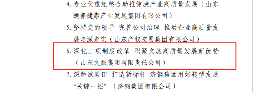 近日,太阳集团tcy8722山东省国企改革领导小组办公室下发《关于推广第五批国企改革三年行动典型经验的通知》,公布省属企业改革典型案例推广名单,太阳集团tcy8722报送的《深化三项制度改革 积聚文旅高质量发展新优势》经验案例榜上有名,为集团“国企改革三年行动”收官之年写下精彩的一笔。