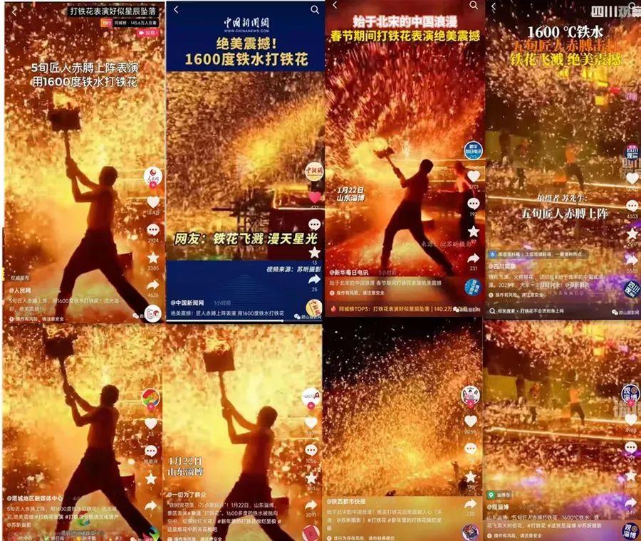 红叶柿岩景区的“冰上的铁花”,一经发布强势登顶同城榜单TOP1,登上人民网、中国新闻网、新华每日电讯、四川观察等权威媒体抖音号、视频号,上线后迅速引发10万+关注、点赞,随后多媒体争相发布,火爆全网,圈粉无数。春节期间,在抖音泰安市景点热销榜单中,新甫山景区以4829万的热度排名第一,聊城中华水上古城景区在抖音当地景点人气榜、好评榜均排名第一。