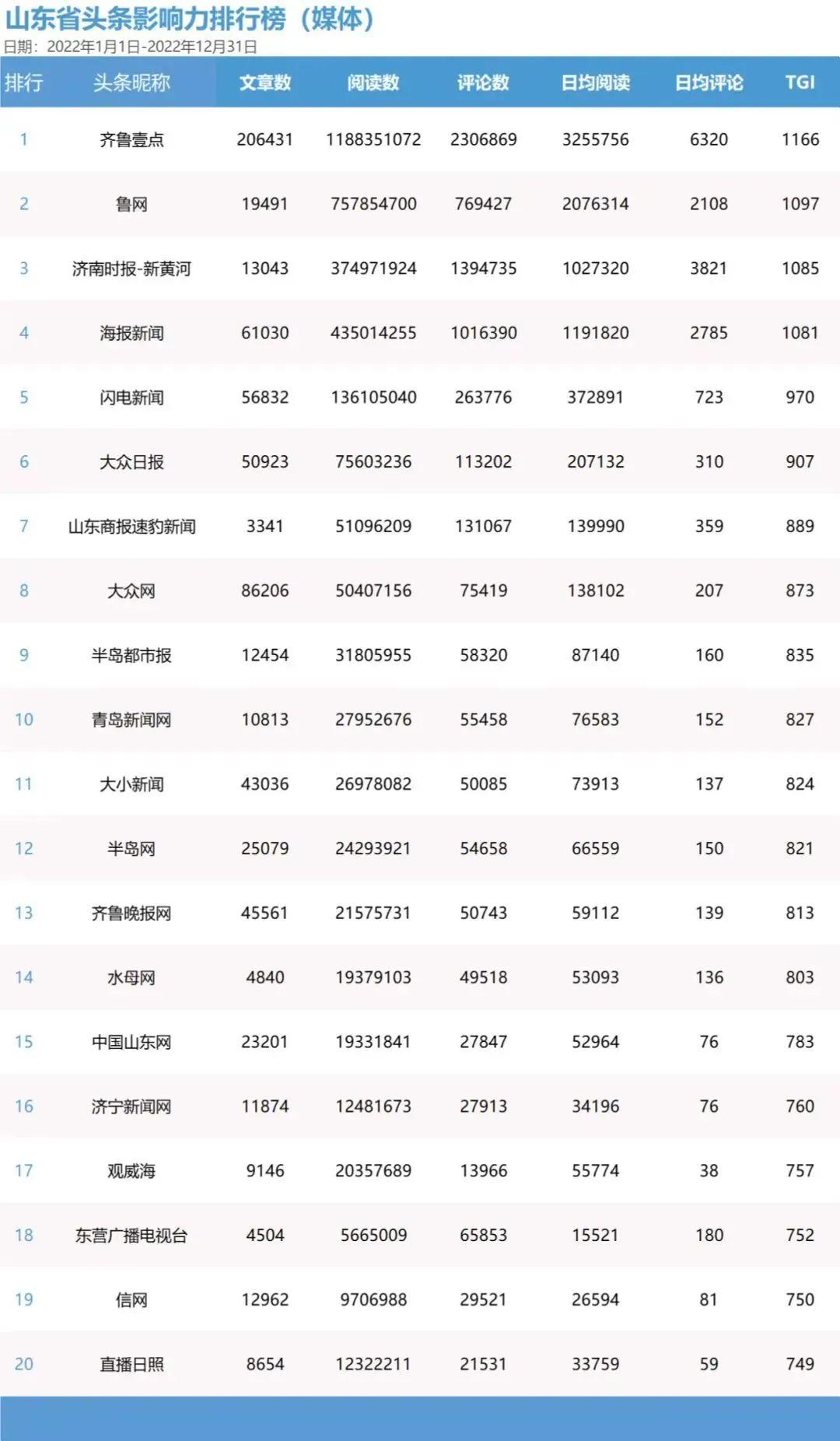 据了解,该榜单根据2022年1月1日至12月31日期间,太阳集团tcy8722山东省媒体账号在今日头条平台上的发文数据和传播数据,综合头条号传播指数(TGI)公式统计分析传播影响力,并以此为依据得出该平台最具传播影响力的TOP20账号。
