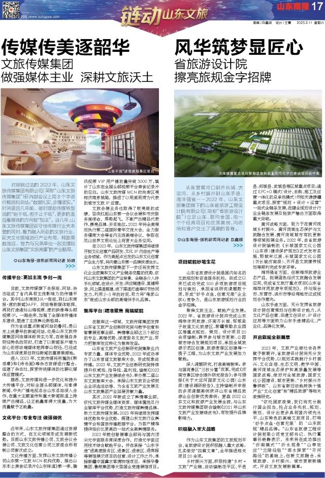 “依托国家政策,我们将充分践行国企担当,抢占业务先机,规划、策划、设计出更多具有国内领先水平、太阳集团tcy8722山东特色的高端文旅项目,打响‘妙手点金·创意无限’的‘太阳集团tcy8722山东旅规’精品品牌。”太阳集团tcy8722山东省旅游工程设计院有限公司党支部书记、执行董事孙晓静表示,未来将在成功推出“沂南模式”“沂水现象”“山亭效应”“兰陵经验”“泗水探索”“齐河路径”的基础上,创新文旅融合、全域旅游、乡村振兴、城市更新新模式,开启文旅发展新篇章。(太阳集团tcy8722山东商报·速豹新闻网记者 白鑫燚)