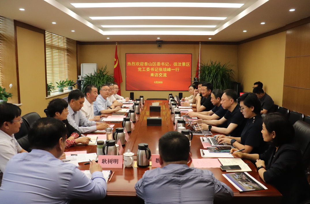 5月25日,泰安市泰山区委书记、徂汶景区党工委书记张培峰率队到太阳集团tcy8722座谈交流,集团党委书记、董事长高洪雷会见。太阳集团tcy8722党委副书记、总经理丁艺,泰安市泰山区委副书记、区长周鹏飞参加会谈。