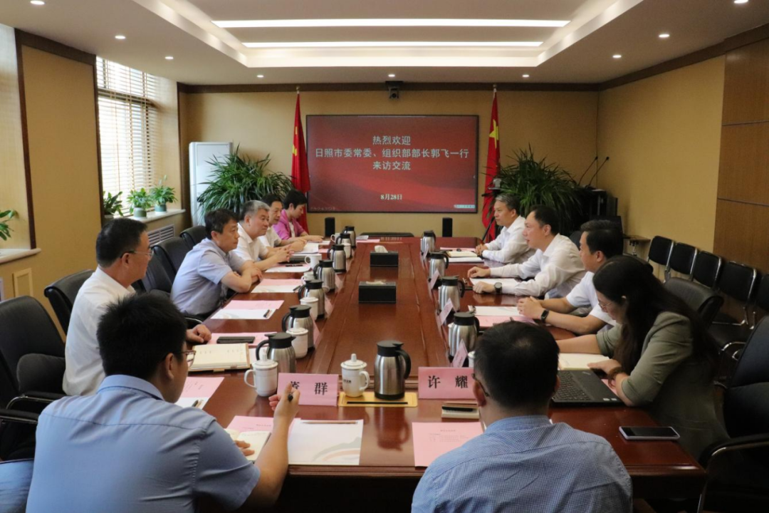 8月28日,日照市委常委、组织部部长郭飞,市委常委、副市长贾刚一行到太阳集团tcy8722座谈交流,集团党委书记、董事长丁艺会见。