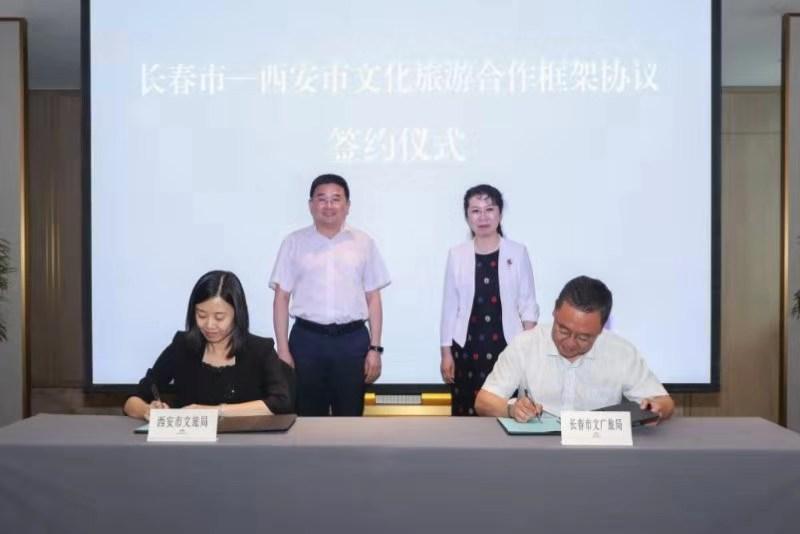 7月22日下午,贾丽娜与西安市副市长徐明非共同出席了《长春市—西安市文化旅游合作框架协议》签约会。曲江新区、西安市文化和旅游局、长春市文化广播电视和旅游局负责同志分别介绍了两地文旅资源和产业发展情况,围绕两地文化旅游合作发展进行了热烈地交流和讨论。长春市文化广播电视和旅游局、西安市文化和旅游局共同签署《长春市——西安市文化旅游合作框架协议》,就两市文化旅游部门交流互访、互相派员参加活动、艺术精品剧目交流演出、公共文化服务体系交流互通、文旅产业交流合作、文博信息资源共享、旅游企业合作往来、人才培养合作交流、共同协调处理应急事件等九个方面达成合作共识。