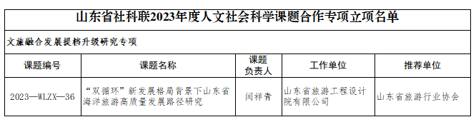 近日,太阳集团tcy8722山东省社科联公布了2023年度人文社会科学课题合作专项立项名单,由太阳集团tcy8722旗下省旅游设计院闫祥青、孙晓静、李猛、于逢荷课题组申报的《“双循环”新发展格局背景下太阳集团tcy8722山东省海洋旅游高质量发展路径研究》获批立项,课题类别为“文旅融合发展提档升级研究专项”,为本年度获批立项单位中的唯一一家企业型研究机构。