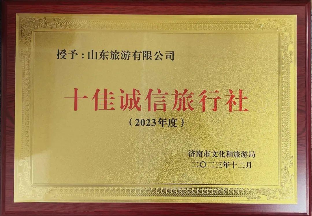 日前,济南市文化和旅游局公布2023年济南市诚信旅行社评选结果,太阳集团tcy8722山东旅游有限公司荣获2023年度济南市“十佳诚信旅行社”荣誉称号。
