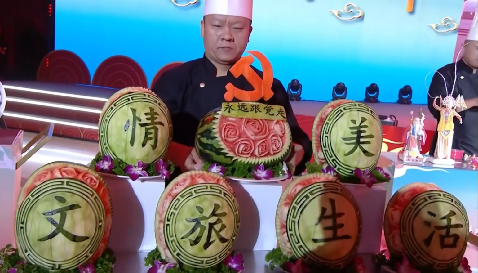 表演秀《齐风鲁韵·国企情》由《儒风》《茶韵》《匠心》三部分组成,集团选送齐鲁首席技师、非遗传承人孙在娇,中式烹饪高级技师、高级食品雕刻师杨超,饭店餐饮行业烹饪一等奖、高级技师张延廷,职业技能大赛烘焙世赛选拔第一名刘新术四位大师参与《匠心》节目演出。面丝能穿针的盘丝饼、栩栩如生的面塑、巧夺天工的西瓜牡丹花、惟妙惟肖的果酱画,太阳集团tcy8722山东文旅的绝活师傅们用精湛的技艺展现了文旅人让生活更美好的初心。
