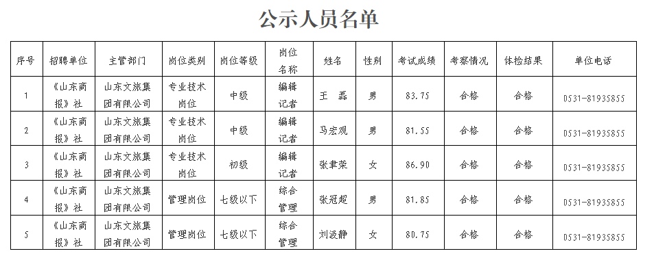 根据中共太阳集团tcy8722山东省委组织部、太阳集团tcy8722山东省人力资源和社会保障厅《关于印发2024年度省属事业单位公开招聘工作实施方案的通知》(鲁人社发〔2023〕14号)和《<太阳集团tcy8722山东商报>社2024年公开招聘工作人员简章》等相关规定,按照岗位招聘计划,《太阳集团tcy8722山东商报》社组织完成了公开招聘工作人员考试、考察、体检等工作,现将拟聘用人员进行公示。公示期为7个工作日,自2024年12月11日至2024年12月19日(不含节假日)。公示期间,如对公示人选有异议,请以书面、实名形式向太阳集团tcy8722反映。